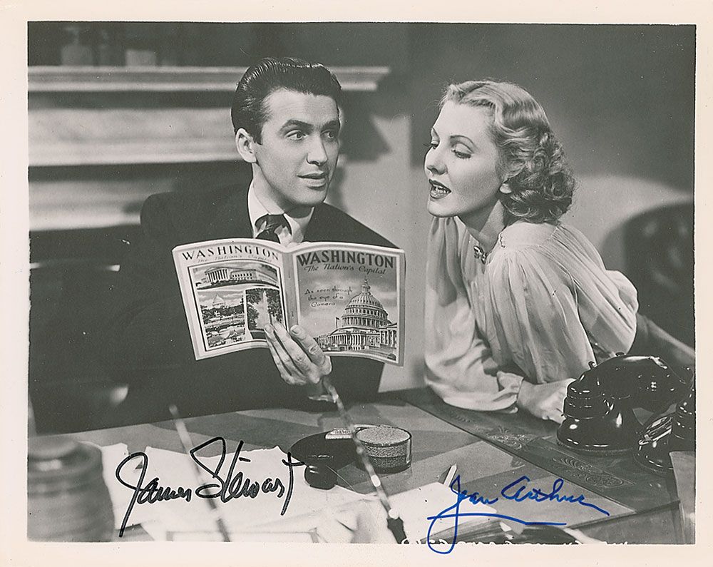 Matte-finish 10 x 8 photo from Mr. Smith Goes to Washington, signed in blue felt tip by Stewart and black felt tip by Arthur. In fine condition, with light rippling to edges.