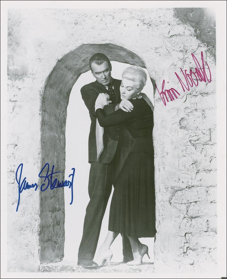 Chilling glossy 8 x 10 photo from Vertigo, signed in blue felt tip by James Stewart and in purple felt tip by Kim Novak. In fine condition.