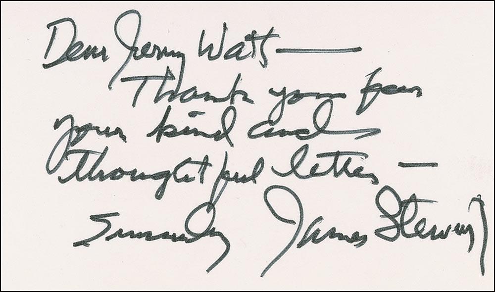 ALS, on a 5 x 3 card, no date. Brief letter to an admirer. In full: “Thank you for your kind letter. ‘It’s a Wonderful Life’ has surprised all of us by its very long life.” In fine condition. Accompanied by a second short thank you letter, also on a 5 x 3 card.