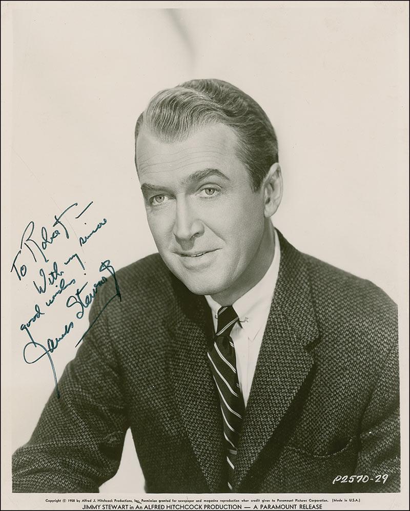 Vintage glossy 8 x 9.75 Paramount promotional photo of Stewart in an Alfred Hitchcock Production, apparently Vertigo, signed and inscribed in fountain pen “To Robert—With my sincere good wishes! James Stewart.” A trimmed lower edge, and scattered light creases and surface marks, otherwise fine condition.