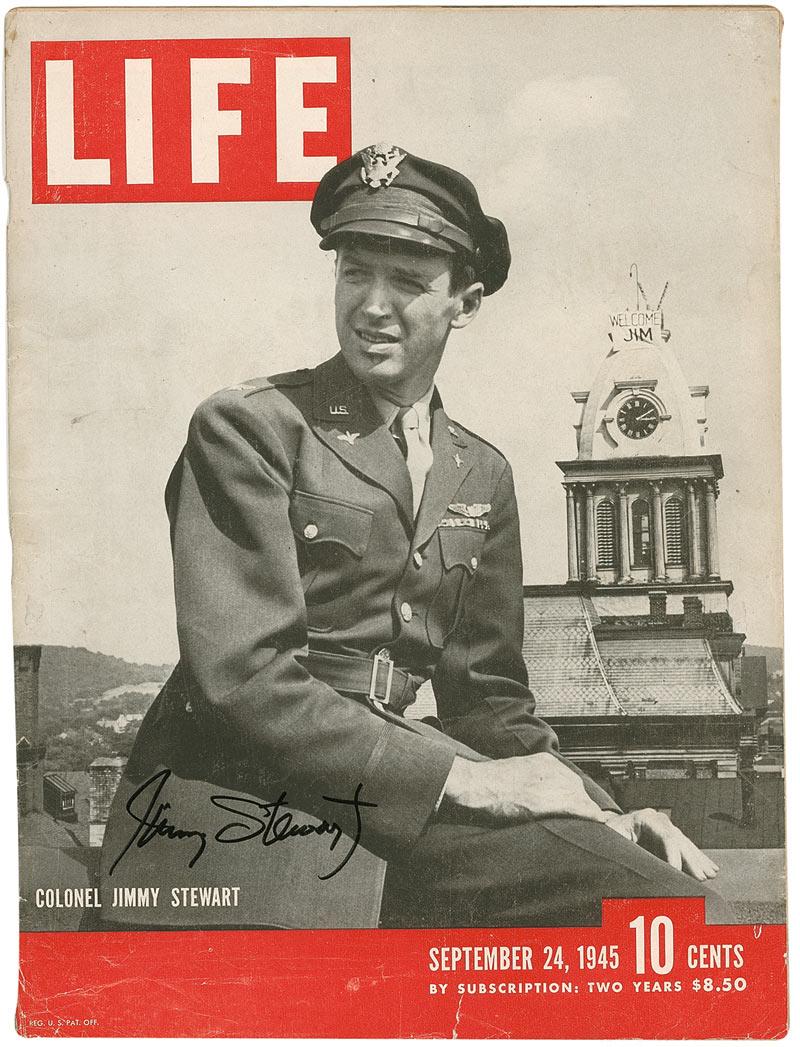 LIFE magazine, September 24, 1945, picturing Jimmy Stewart in uniform as a colonel in the US Army Air Corps, signed later on the front cover in black felt tip “Jimmy Stewart.” In very good condition, with scattered creasing and handling wear, a small tear at the bottom of the cover, and some toning and soiling.
