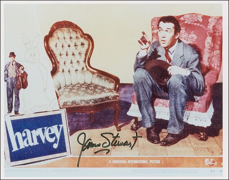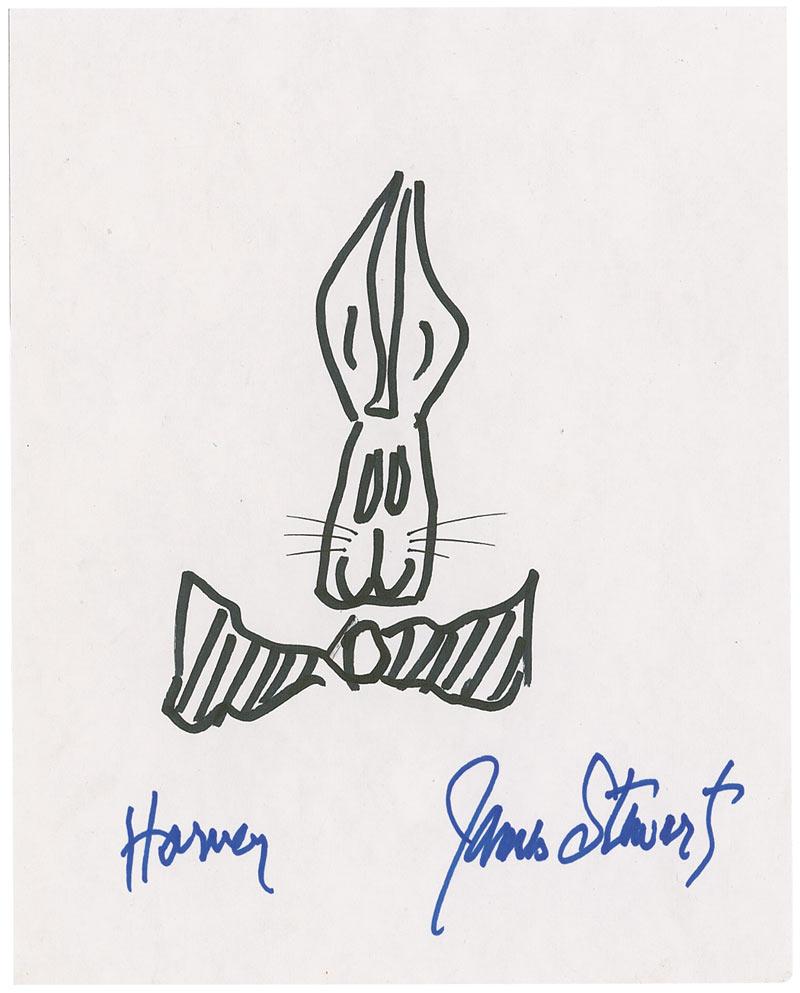 Two items: original felt tip sketch of Harvey the Rabbit on an off-white 8 x 10 card, signed “James Stewart,” and “Harvey”; and a color glossy 10 x 8 photo of a Harvey lobby card, signed in black felt tip. In fine condition.