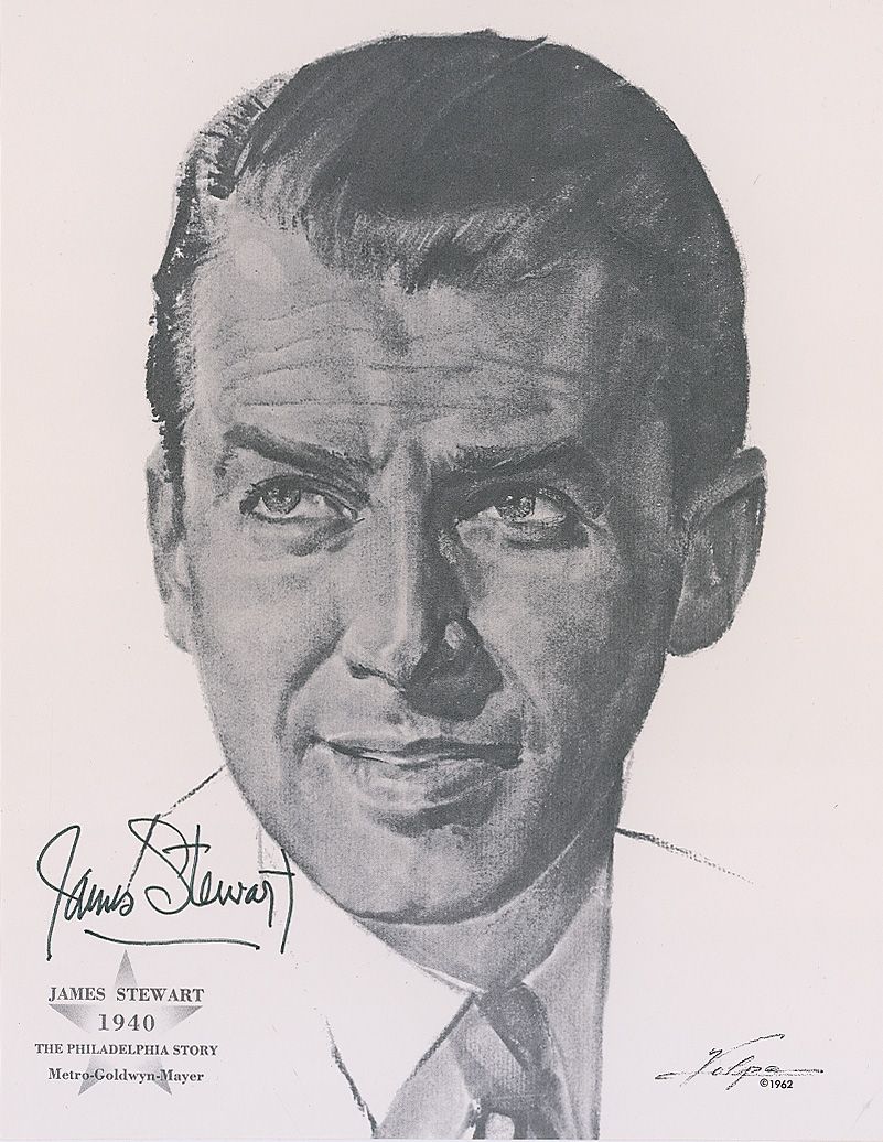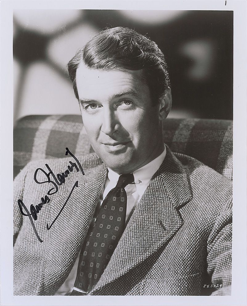 Two items: glossy 8 x 10 photo, signed in black felt tip, “James Stewart”; and an 8.25 x 10.5 Volpe print of Stewart for The Philadelphia Story, signed in black felt tip. In fine condition, with light creasing to lower left corner of photo.