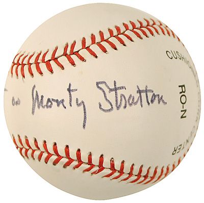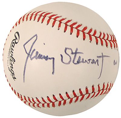 Official Rawlings National League baseball signed in black felt tip on the side panel through the sweet spot, “Jimmy Stewart as Monty Stratton.” In fine condition.
