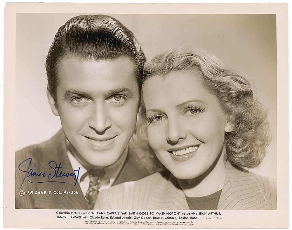 Glossy 10 x 8 Columbia Pictures promotional photo of Stewart and Jean Arthur for Mr. Smith Goes to Washington, signed in blue felt tip, “James Stewart.” In fine condition.