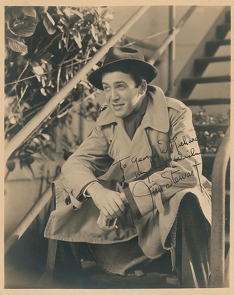 Outstanding vintage matte-finish 8 x 10 photo of a very young Stewart sitting on stairs, signed and inscribed in fountain pen, “To George W. Richards, My best wishes, Jim Stewart.” In fine condition.
