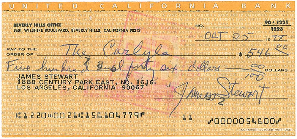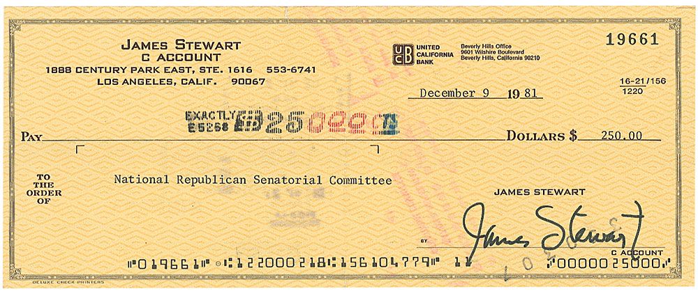 Two checks: a personal check, 6 x 3, filled out and signed by Stewart, payable to the Carlyle for $546.00, dated October 25, 1978; and a business check, 8.5 x 3.5, filled out in type and signed by Stewart, payable to the National Republican Senatorial Committee for $250.00, dated December 9, 1981. In fine condition, with bank stamps lightly touching small portions of both signatures, and a central vertical fold to the business check.