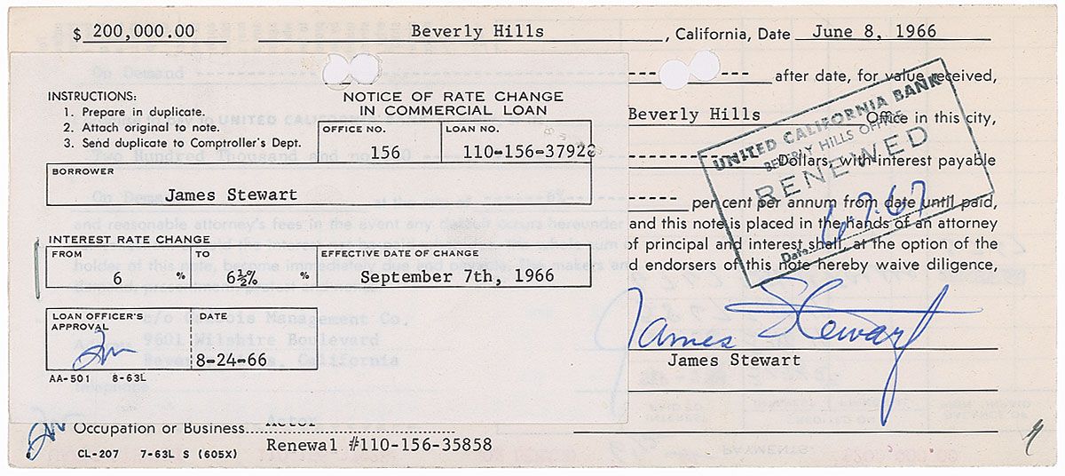 DS, one page, 8.5 x 3.75, June 8, 1966. Loan agreement between Stewart and the United California Bank in which he agrees to pay back $200,000 at a rate of 6%. In fine condition, with expected document wear.