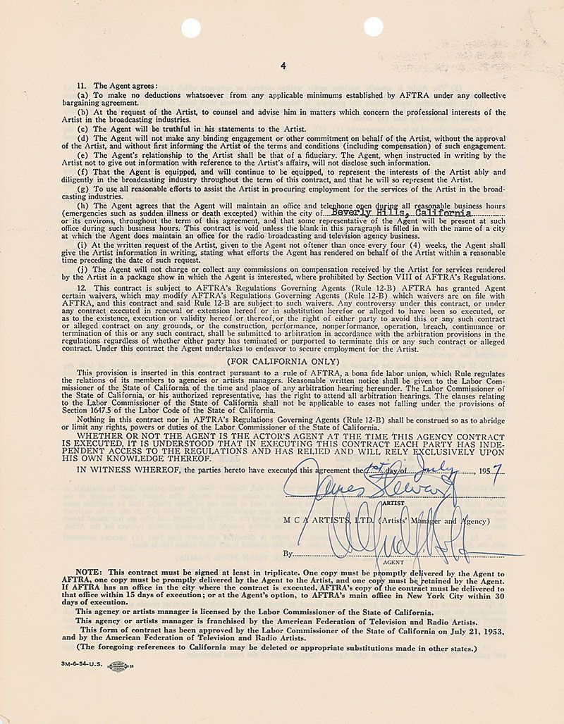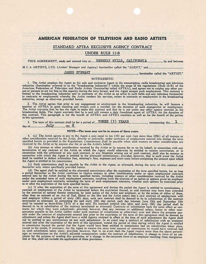 DS, four pages on two adjoining sheets, 8.5 x 11, July 1, 1957. Standard AFTRA Exclusive Agency Contract in which Stewart agrees to be represented by the MCA Artists for a period of three years. Signed at the conclusion in blue ballpoint by Stewart and countersigned by an agent. In fine condition, with expected document wear.