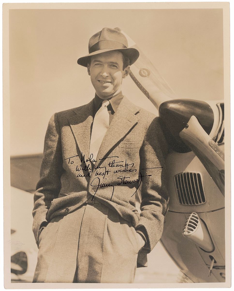 Desirable matte-finish 8 x 10 photo of Stewart presumably posing for a publicity shot for the 1957 film The Spirit of St. Louis, signed and inscribed in black ink, “To Nola—With my thanks and best wishes—Jimmy Stewart.” In fine condition, with a trivial crease to upper left corner tip and fingerprint to lower left edge.
