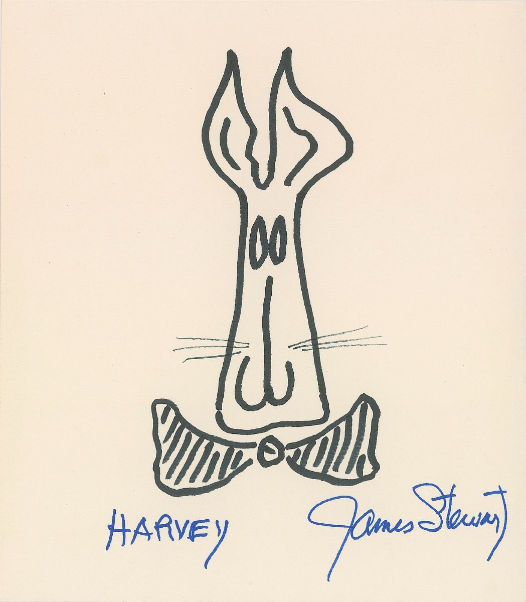 Original felt tip sketch of Harvey the Rabbit wearing a bowtie on an off-white 9.25 x 10.75 textured cardstock sheet, signed and titled below in blue felt tip, “Harvey, James Stewart.” In fine condition.