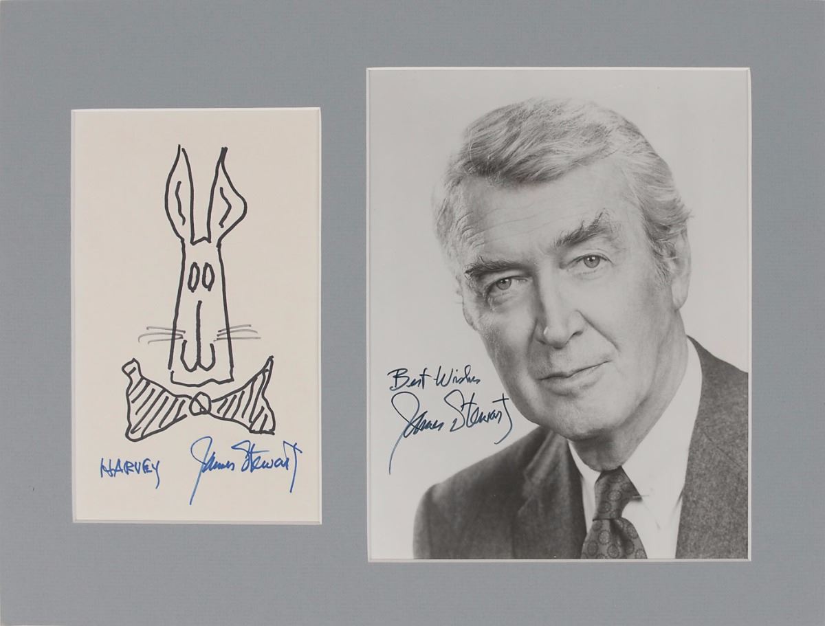 Two items: an original signed felt tip sketch of Harvey the Rabbit wearing a bow tie on an off-white 4.75 x 7.75 sheet, signed below in blue felt tip, “Harvey, James Stewart”; and a glossy 7.25 x 9.25 portrait of the actor in later age, signed in black felt tip, “Best Wishes, James Stewart.” Matted together to an overall size of 16 x 12. In overall fine condition.