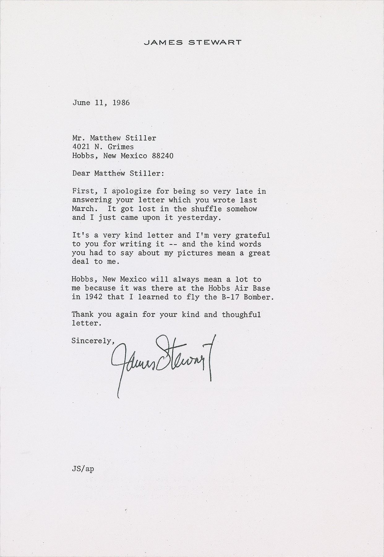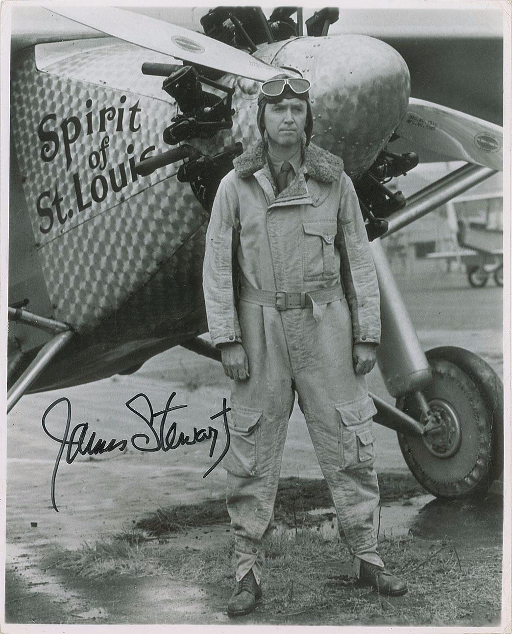 Two items: a TLS, one page, 7.25 x 10.5, personal letterhead, June 11, 1986, addressed to Matthew Stiller of Hobbs, New Mexico, in full: "First, I apologize for being so very late in answering your letter which you wrote last March. It got lost in the shuffle somehow and I just came upon it yesterday. It's a very kind letter and I'm very grateful to you for writing it—and the kind words you had to say about my pictures mean a great deal to me. Hobbs, New Mexico will always mean a lot to me because it was there at the Hobbs Air Base in 1942 that I learned to fly the B–17 bomber. Thank you again for your kind and thoughtful letter." Also includes a glossy 7.75 x 9.75 full-length photo of Stewart as Charles Lindbergh in the 1957 film The Spirit of St. Louis, signed in black felt tip. Reverse of photo bears three Pictorial Parade stamps and an affixed caption stating: "Popular star James Stewart…has been nominated by President Eisenhower for the rank of brigadier general. Stewart is the first actor in history to achieve this rank…[and] distinguished himself during World War II, flying 25 bombing missions over Germany. He was a colonel before his discharge." In overall fine condition. Accompanied by the original mailing envelope.