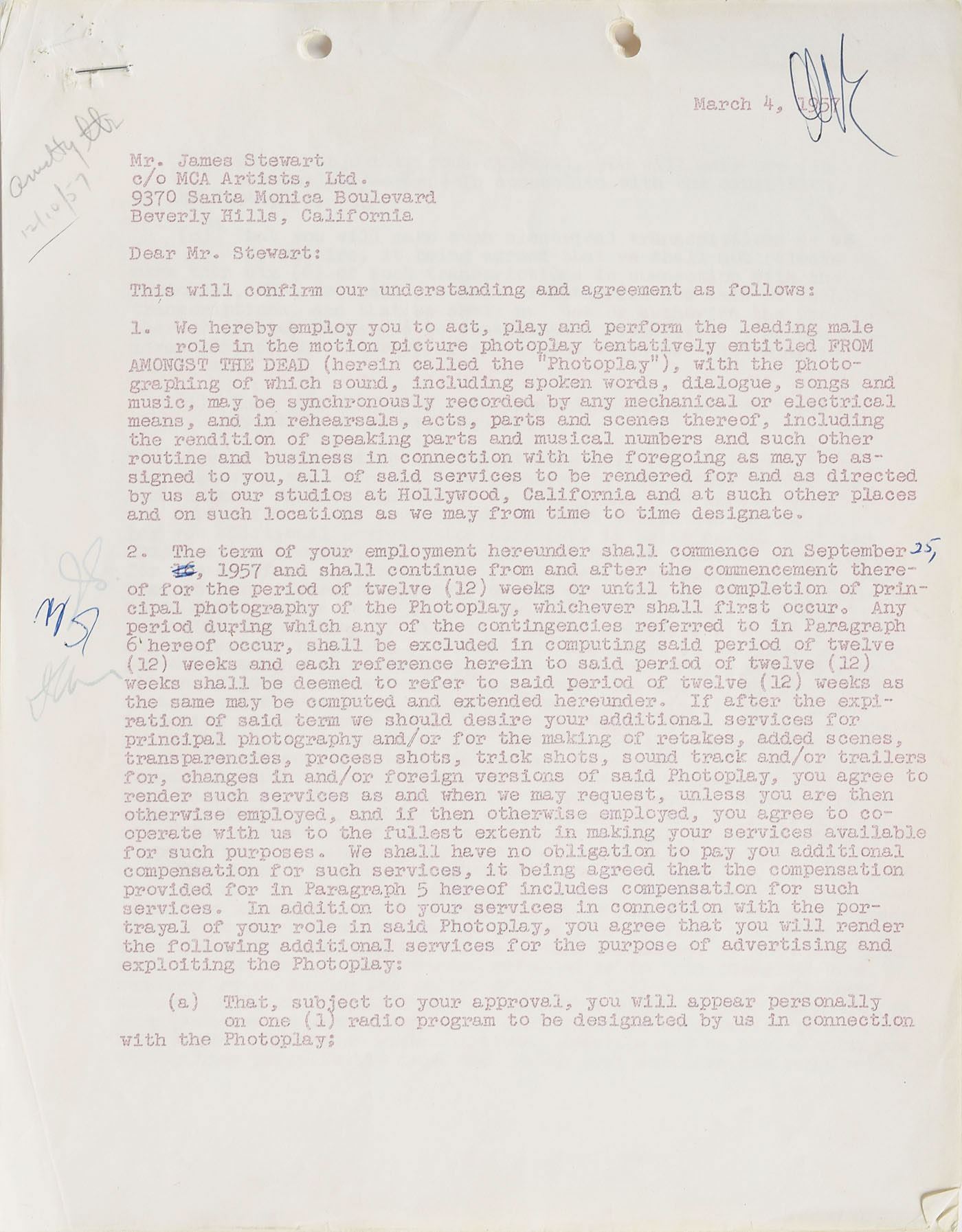 DS, thirteen pages, 8.5 x 11, March 4, 1957. Contract between Paramount Pictures, Alfred J. Hitchcock Productions, and James Stewart, in which the latter agrees to "act, play and perform the leading male role in the motion picture photoplay tentatively entitled From Amongst the Dead." Signed at the conclusion in fountain pen by Stewart, who adds his initials to emendations made on pages 1 and 11; also signed by the Vertigo screenwriter, Samuel A. Talyor. Includes a two-page addendum to the contract, in which Paramount lends "the services of James Stewart" to Alfred J. Hitchcock Productions. In fine condition, with usual document wear. This fantastic movie contract relates to the lead casting for Hitchcock's 1958 masterpiece Vertigo, a film that was adapted from the French novel D'entre les morts (From Among the Dead) by Pierre Boileau and Thomas Narcejac. Stewart was cast as John 'Scottie' Ferguson, a former police detective forced into early retirement because an incident in the line of duty has caused him to develop acrophobia and vertigo. Scottie is soon hired by an acquaintance, Gavin Elster, as a private investigator to follow Gavin's wife Madeleine, who he believes is in danger. Although Vertigo earned mixed reviews upon initial release, the film is often cited as a classic Hitchcock work and one of the defining films of his career.