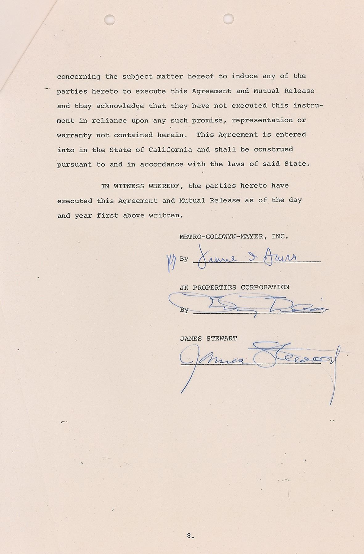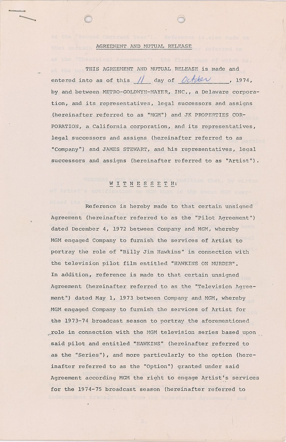 DS, eight pages, 8.5 x 13, October 11, 1974. Mutual release agreement between James Stewart and Metro-Goldwyn-Mayer for his contract associated with the television series Hawkins. In part: "Reference is hereby made to that certain unsigned Agreement…whereby MGM engaged Company to furnish the services of Artist to portray the role of 'Billy Jim Hawkins' in connection with the television pilot film entitled 'Hawkins on Murder.' In addition, reference is made to that certain unsigned agreement…whereby MGM engaged Company to furnish the services of Artist for the 1973–74 broadcast season to portray the aforementioned role in connection with the MGM television series based upon said pilot and entitled 'Hawkins'…and more particularly to the option…granted under said Agreement according MGM the right to engage Artist's services for the 1974–75 broadcast season…by virtue of Artist's notification to MGM that in the event MGM exercised its Option under the Television Agreement, Artist would not, for reasons of health, appear in more than four (4) episodes of the Series during the Second Contract Year, both Company and Artist have refused to perform their contractual obligations." Signed at the conclusion in blue ballpoint by Stewart and two company representatives. In fine condition. Although Stewart won the Golden Globe for Best Actor in Television Drama for his portrayal of Billy Jim Hawkins, he felt like the quality of scripts and directors in television did not meet the same standards as those he was accustomed to for theatrical films; by declining to fulfill the option in his contract, he essentially forced the show to be canceled.
