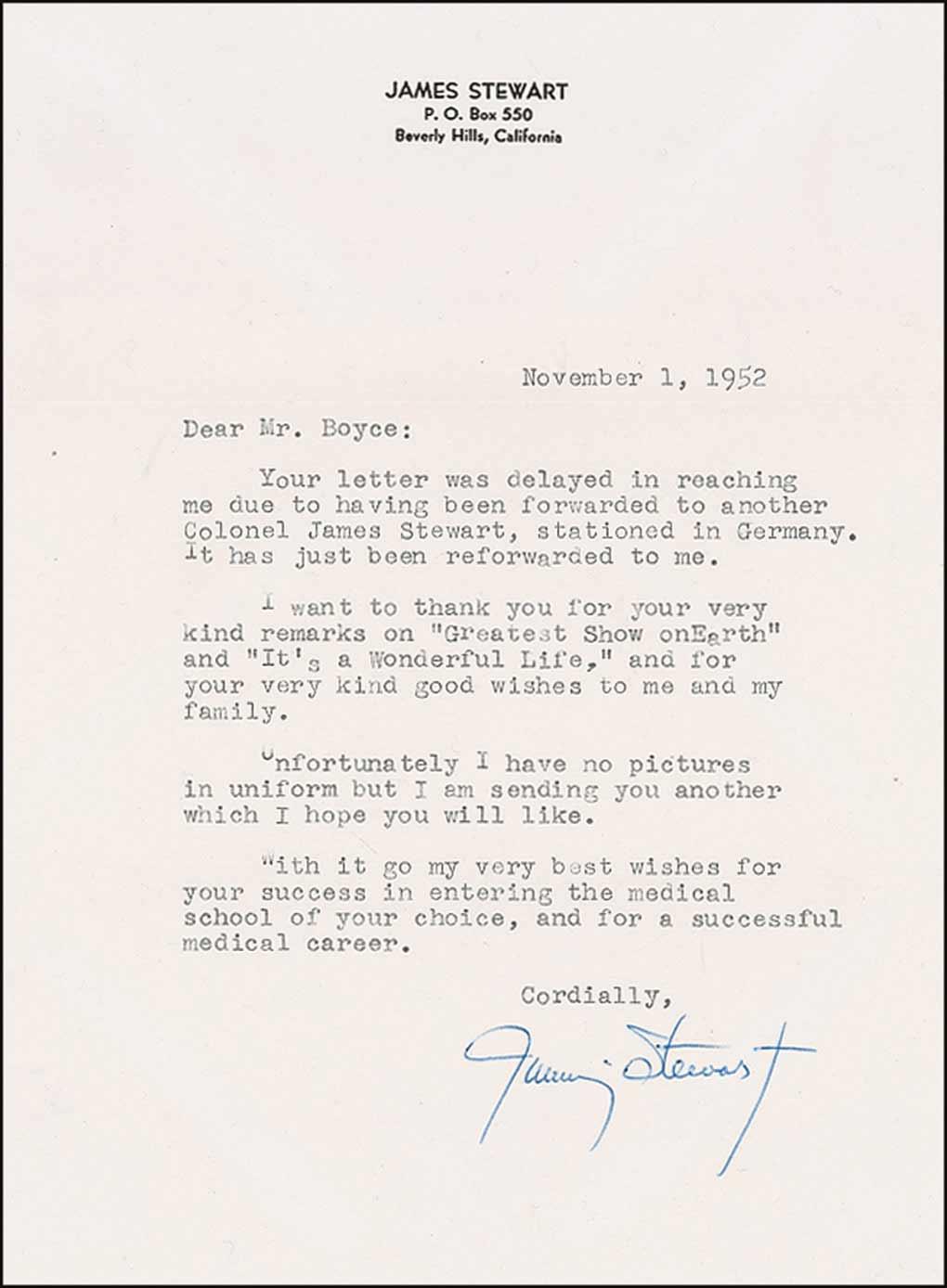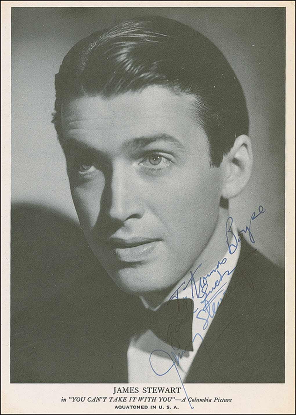Two items: TLS, signed “Jimmy Stewart,” one page, 6.25 x 8.5, personal letterhead, dated November 1, 1952. Stewart responds to an admirer. In part: “Your letter was delayed in reaching me due to having been forwarded to another Colonel James Stewart, stationed in Germany…I want to thank you for your very kind remarks on ‘The Greatest Show On Earth,’ and ‘It’s A Wonderful Life…Unfortunately I have no pictures in uniform but I am sending you another which I hope you will like.”; and a vintage 5 x 7 Columbia promotional photo, signed and inscribed in blue ink to the letter’s recipient. Accompanied by the original mailing envelope. In fine condition, with a paperclip impression to photo.