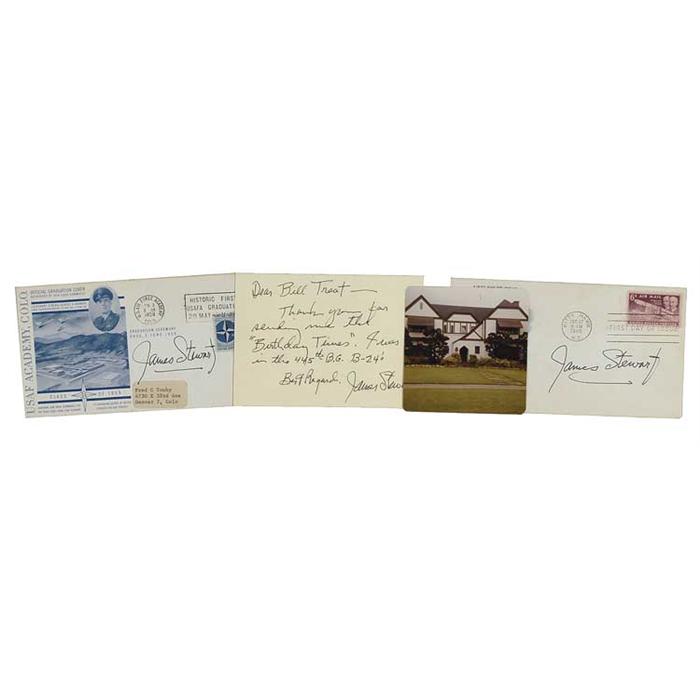 Three items: An FDC bearing a cachet honoring the Wright Brothers return to the United States from England, signed in black ink; a commemorative cover with a cachet honoring the USAF graduating class of 1959, signed on the front in black ink; and a short ALS, sending thanks for a sent article, and accompanied by the original mailing envelope, addressed in Stewart’s hand and postmarked May 17, 1988. Also accompanied by a candid color snapshot of Stewart’s home in Beverly Hills. In fine condition. RRAuction COA.