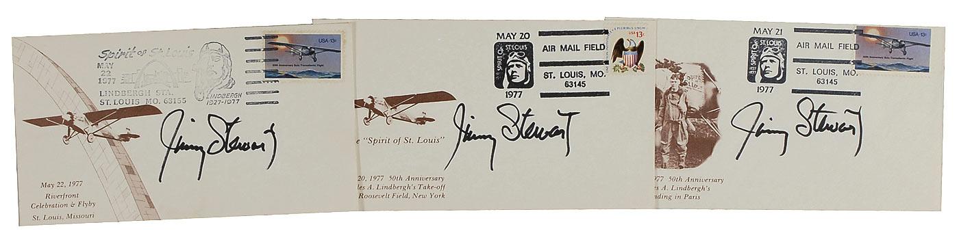 Three different commemorative covers, all honoring the 50th anniversary of the flight of the Spirit of St. Louis, each signed on the front in black felt tip, “Jimmy Stewart.” In overall fine condition. Stewart portrayed Charles Lindbergh in the movie Spirit of St. Louis. Pre-certified PSA/DNA and RRAuction COA.
