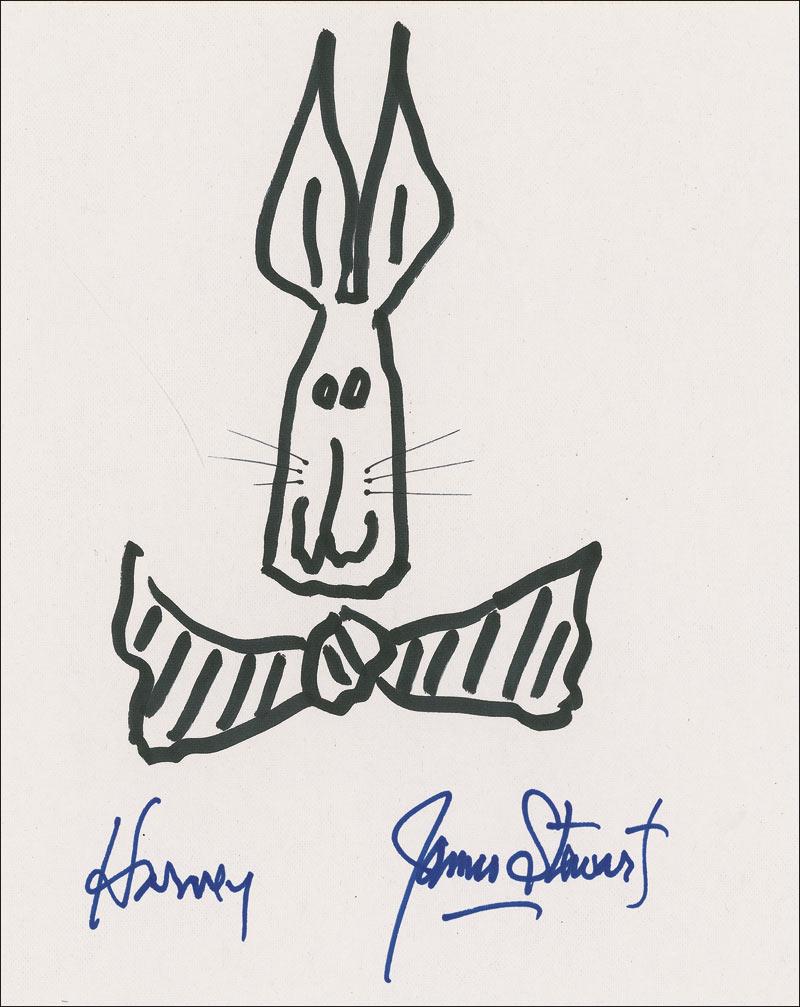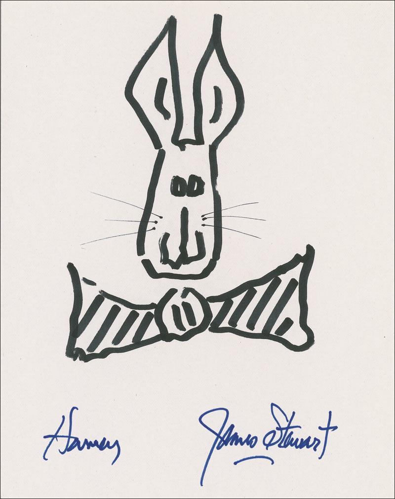 Pair of original signed felt tip sketches of Harvey the rabbit on two individual off-white 8 x 10 cards, each signed at the bottom, “James Stewart,” and “Harvey.” In very fine condition. Pre-certified PSA/DNA and RRAuction COA.