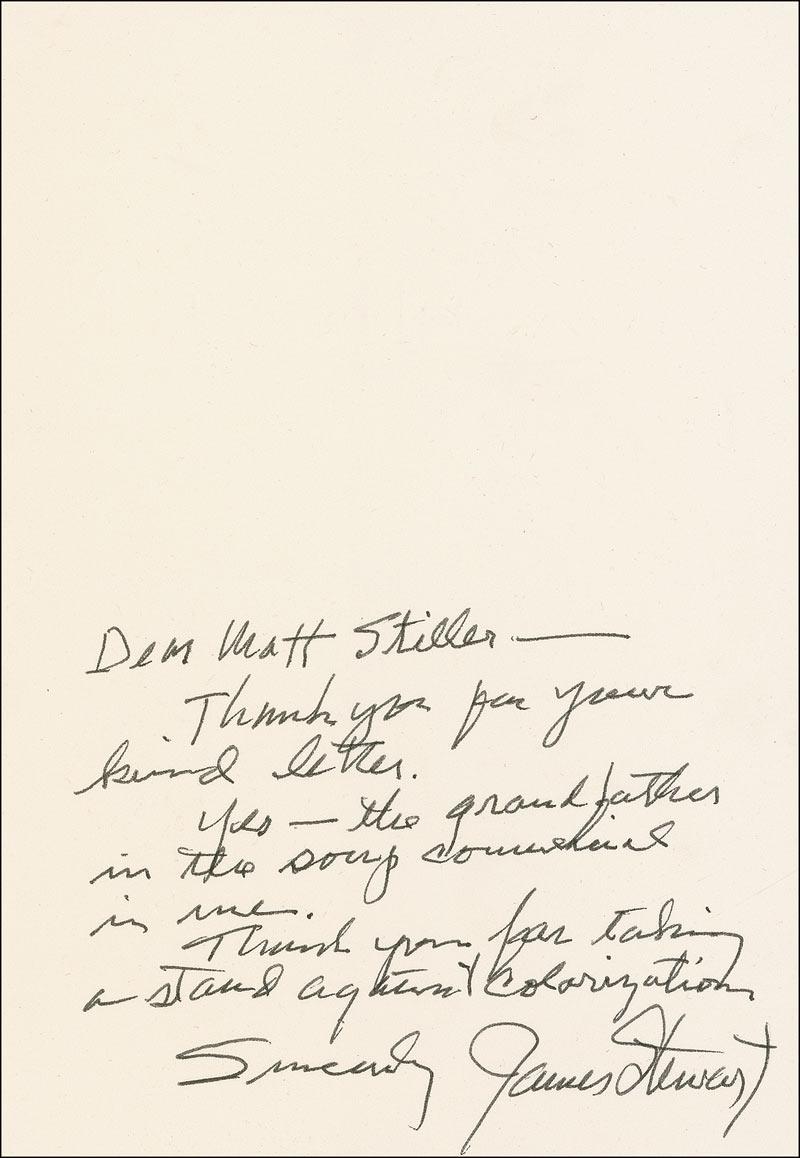 ALS, on the inside of a 5.25 x 3.75 thank you note, no date, but postmarked January 16, 1989. Short letter of thanks and answering a question. In full: “Thank you for your kind letter. Yes—the grandfather in the soup commercial is me. Thank you for taking a stand against colorization.” In very fine condition. Accompanied by the original mailing envelope addressed in Stewart’s hand. In 1988, Stewart made an impassioned plea in Congressional hearings, along with colleagues Burt Lancaster, Katharine Hepburn, Ginger Rogers, and film director Martin Scorsese, against Ted Turner's decision to 'colorize' classic black and white films, including It's a Wonderful Life.