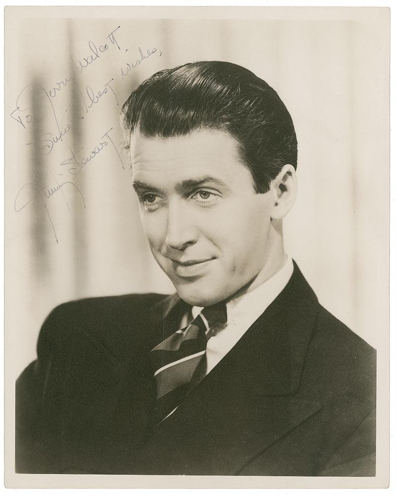 Handsome vintage matte-finish 8 x 10 photo, signed and inscribed in fountain pen “To Jerry Walcott, Sincere best wishes, Jimmy Stewart.” In fine condition.