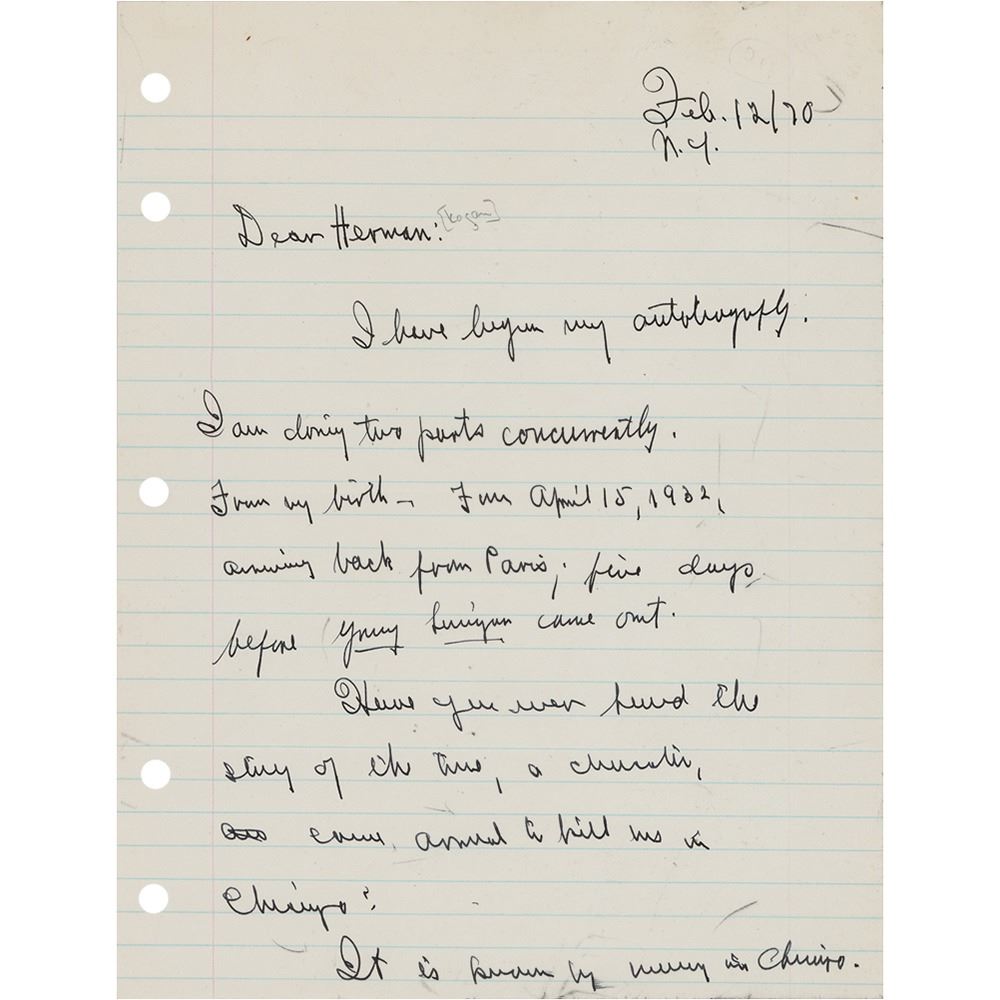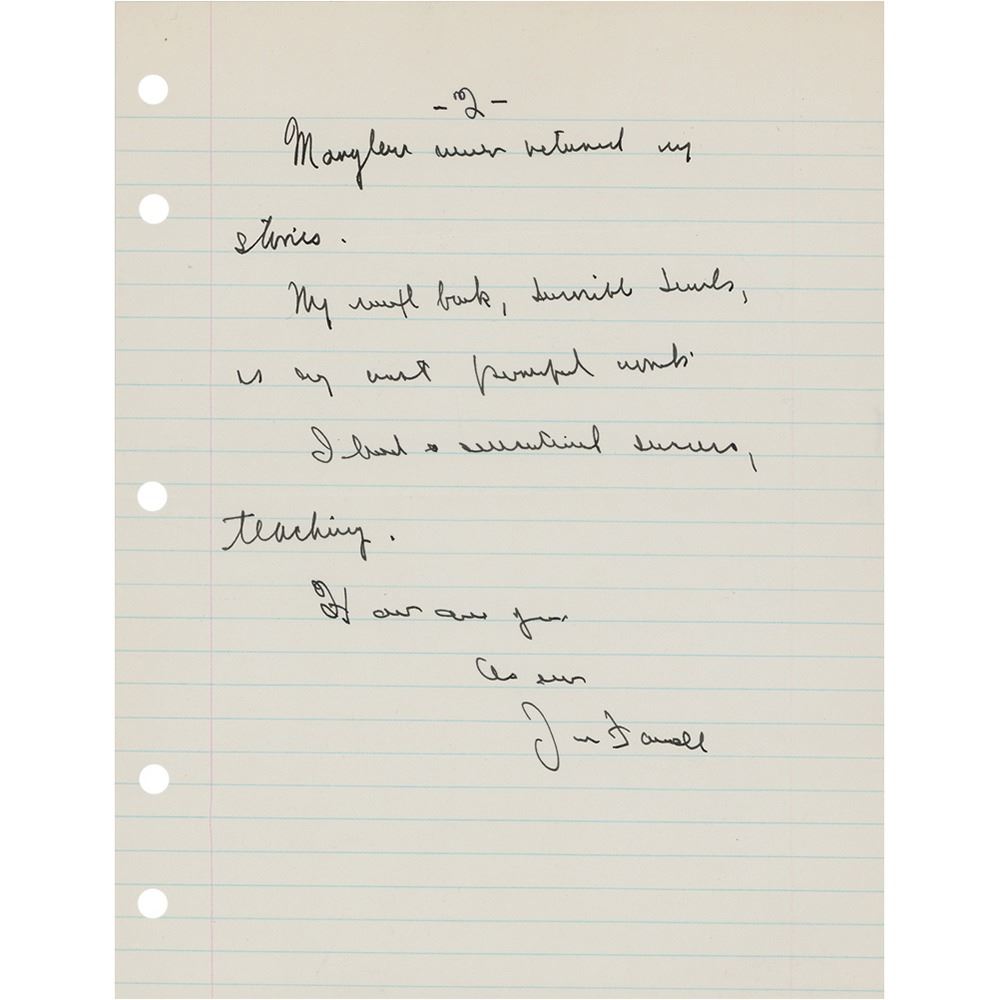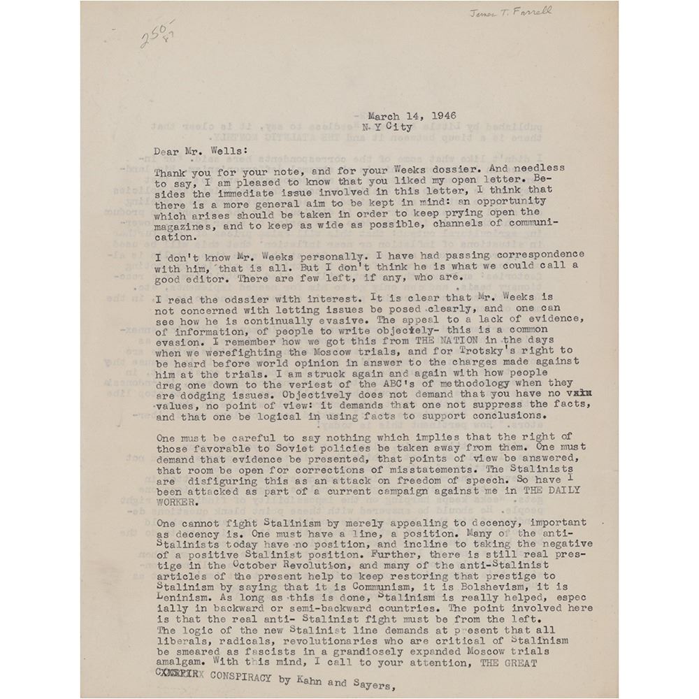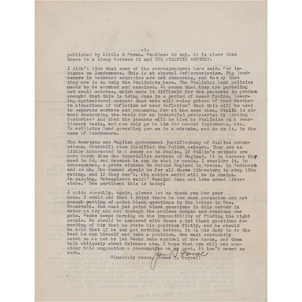 Two letters by Farrell: a TLS signed in pencil, "James T. Farrell," one page both sides, 8.5 x 11, March 14, 1946, in part: "It is clear that Mr. Weeks is not concerned with letting issues be posed clearly, and one can see how he is continually evasive. The appeal to a lack of evidence, of information, of people to write objectively—this is a common evasion. I remember how we got this from The Nation in the days when we were fighting the Moscow trials, and for Trotsky's right to be heard before world opinion in answer to the charges made against him at the trials. I am struck again and again with how people drag one down to the veriest of the ABC's of methodology when they are dodging issues. Objectiv[ity] does not demand that you have no values, no point of view: it demands that one not suppress the facts, and that one be logical in using facts to support conclusions…One cannot fight Stalinism by merely appealing to decency, important as decency is. One must have a line, a position. Many of the anti-Stalinists have no position, and incline to take the negative of a positive Stalinist position…Further there is real prestige in the October revolution, and many of the anti-Stalinists articles of the present help to keep restoring that prestige to Stalinism by saying that it is Communism, it is Bolshevism, it is Leninism As long as this is done, Stalinism is really helped, especially in the backward or semi-backward countries. The point here is that the real anti-Stalinist fight must be from the left…This is abysmal Jeffersonianism. Big land owners in backward countries are not democrats, and to say that they are is to help the Stalinists here. The Stalinist land policies need to be watched and examined…The American and English government justified many of Satlin's annexations. Churchill even justified the Polish seizure. They are as little interested in decency as is Stalin…The demand should be for all…liberators to stop liberating, and if they don't they whole world will be in chains. In passing, Robespierre said: Mankind does not love armed liberators. How pertinent this is today!"; and an ALS signed "Jim Farrell," two pages, 8 x 10.5, February 12, 1970, in part: "I have begun my autobiography. I am doing two parts concurrently. From my birth–From April 15, 1932, arriving back from Paris; five days before Young Lonigan came out." In overall fine condition.