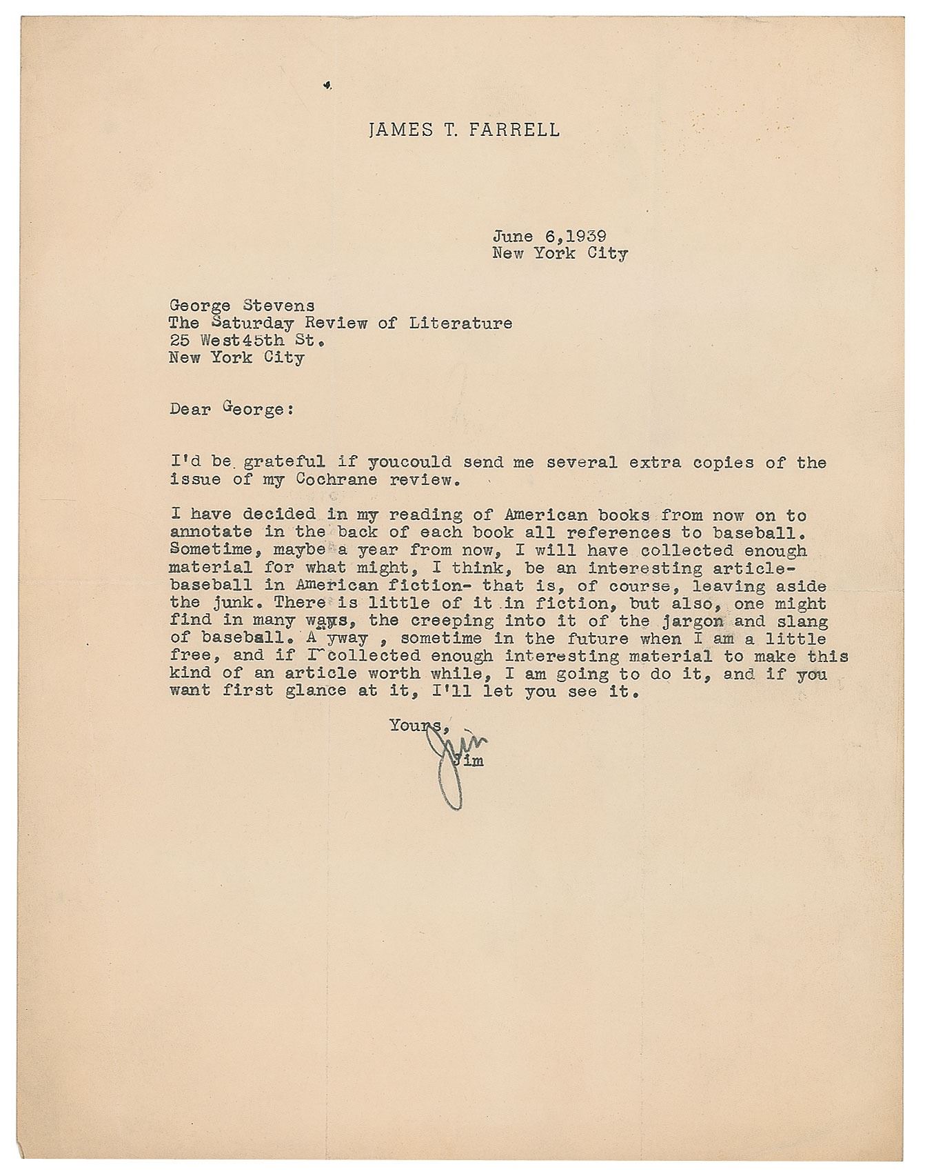 TLS signed “Jim,” one page, 8.5 x 11, personal letterhead, June 6, 1939. Letter to George Stevens of the Saturday Review of Literature, in part: "I have decided in my reading of American books from now on to annotate in the back of each book all references to baseball. Sometime, maybe a year from now, I will have collected enough material for what might, I think, be an interesting article—baseball in American fiction—that is, of course, leaving aside the junk. There is little of it in fiction, but also, one might find in many ways, the creeping into it of the jargon and slang of baseball. Anyway, sometime in the future when I am a little free, and if I collected enough interesting material to make this kind of an article worth while, I am going to do it, and if you want first glance at it, I'll let you see it." In very good to fine condition, with creasing to the margins.