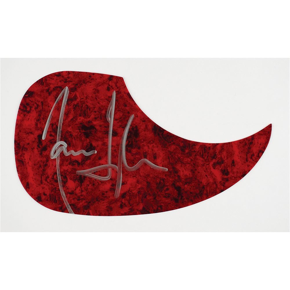 Two red marble pickguards for an acoustic guitar, both signed in silver ink by James Taylor. In overall fine condition.