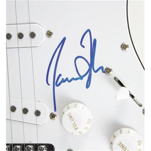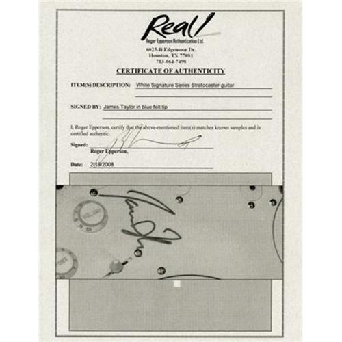 <B>James Taylor Signed Guitar.</B></I> A white Signature Series electric guitar with a James Taylor logo and image on the body, signed on the pick guard by Taylor in blue felt tip. In Excellent condition. <I> Accompanied by a COA from Roger Epperson Authentication LTD.</B></I><BR><BR><b>Shipping:</b> Musical Instruments, Large (<a target="_blank" href="http://www.heritageauctions.com/common/shipping.php">view shipping information</a>)