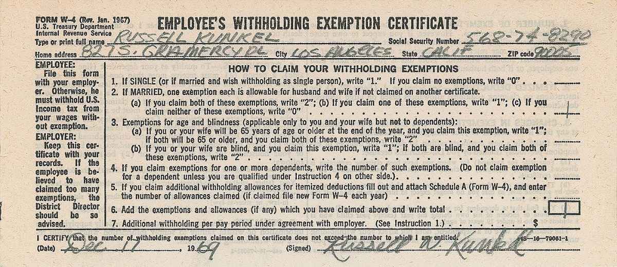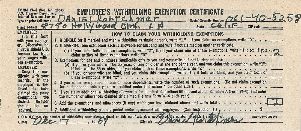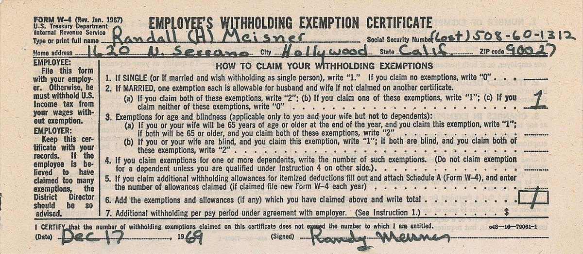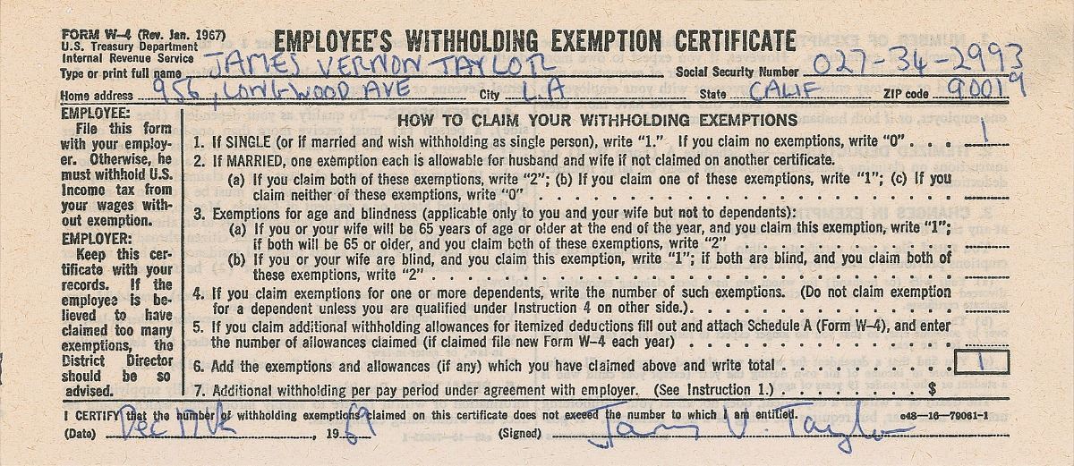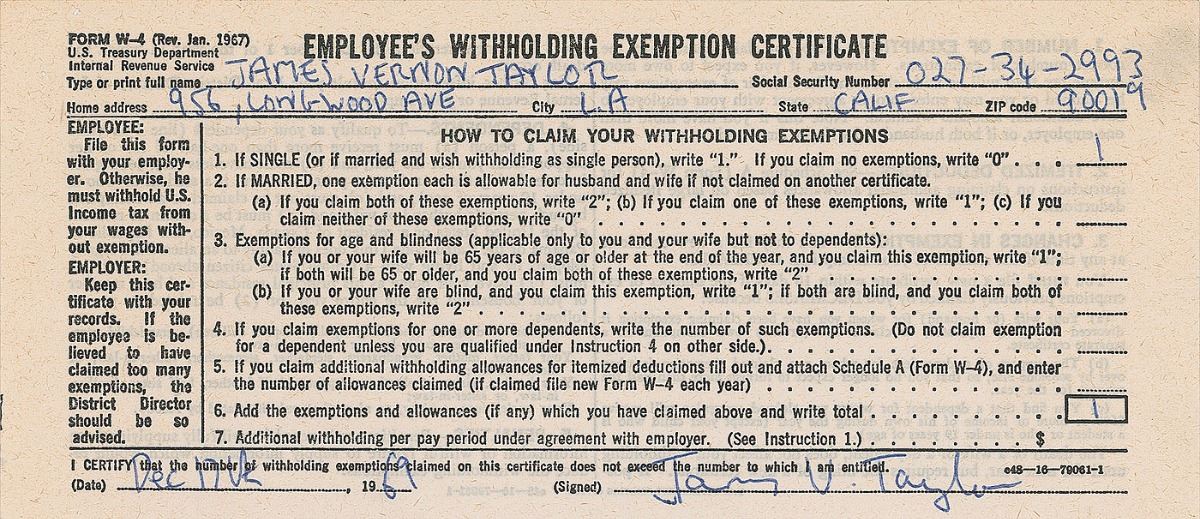Five DSs filled out and signed by Taylor and his group members, each one page, 8 x 3.5, December 17, 1969. Employee’s withholding exemption certificates filled out and signed by James Taylor, Russ Kunkel, Daniel Kortchmar, Randy Meisner, and Christopher Darrow. In fine condition. These were completed while Taylor was recording his most famous album Sweet Baby James. Accompanied by a certificate of authenticity from Tracks.