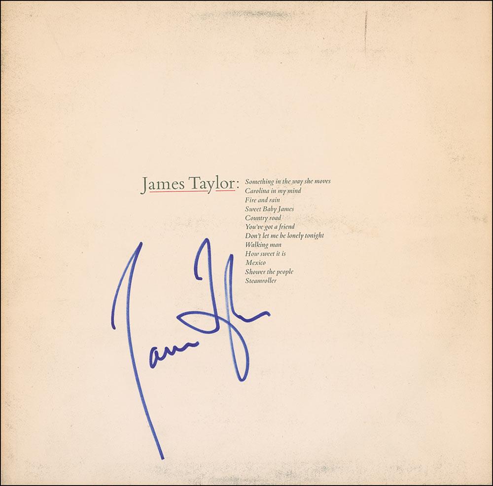 Two signed albums, JT and James Taylor’s Greatest Hits, each signed on the front cover in blue felt tip. The records are not included. In fine condition, with scattered light wear to both covers, label remnant to JT and some toning and foxing to Greatest Hits.
