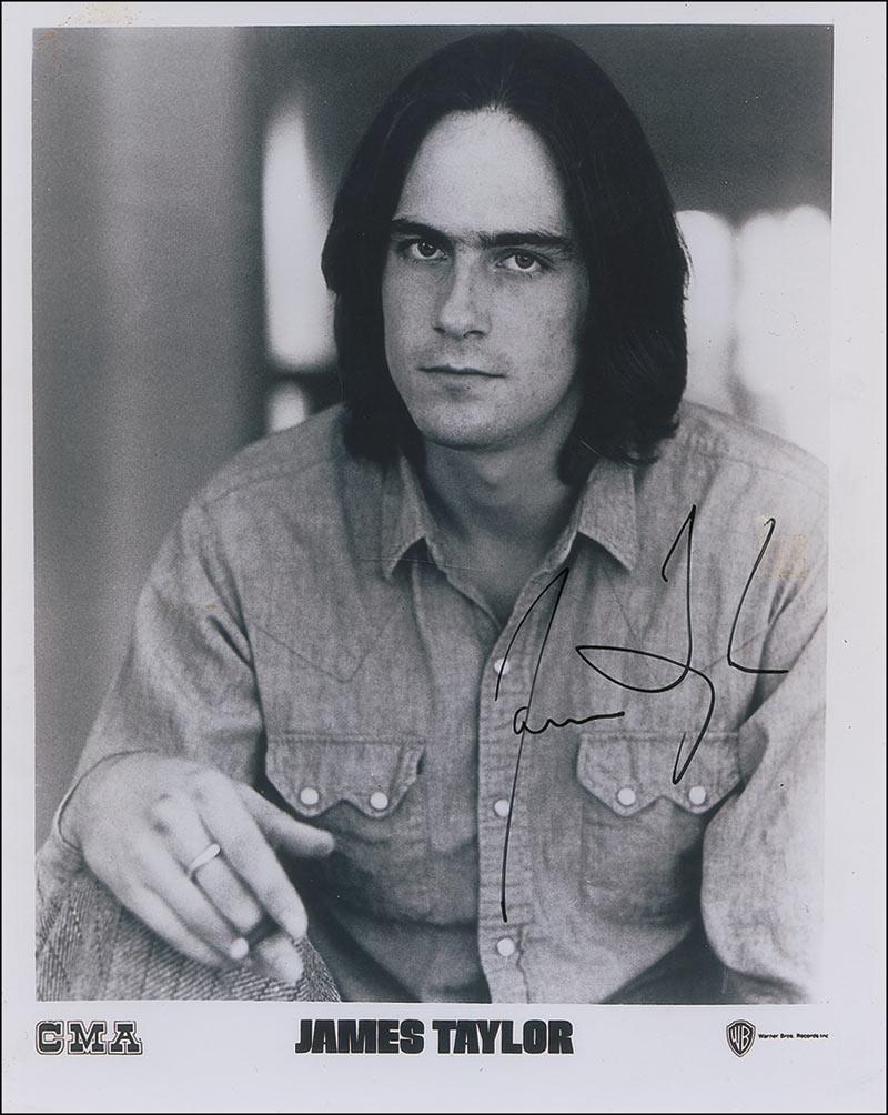 Two items: glossy 8 x 10 Warner Brothers publicity photo signed in black felt “James Taylor”; and James Taylor’s Greatest Hits album also signed in black felt tip. In overall fine condition, with a few light surface marks to the photo and mild soiling and staining to the album. The record is not included.