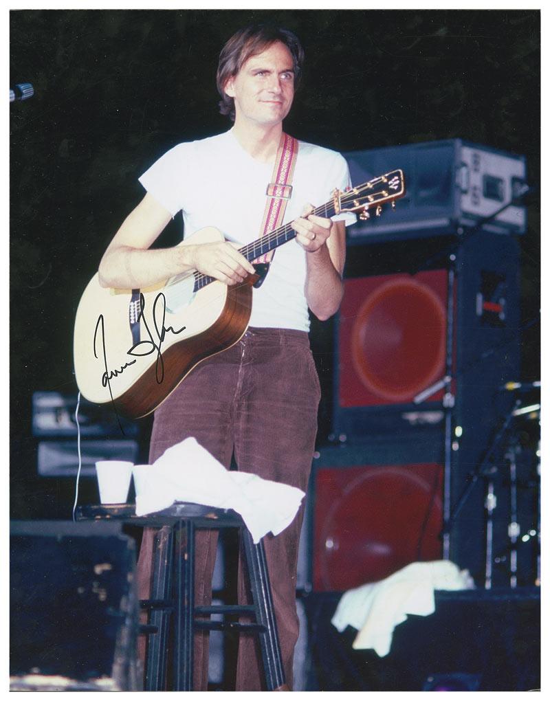 Color glossy 11 x 14 photo of a younger Taylor holding his guitar on a concert stage, signed in black felt tip. In fine condition.