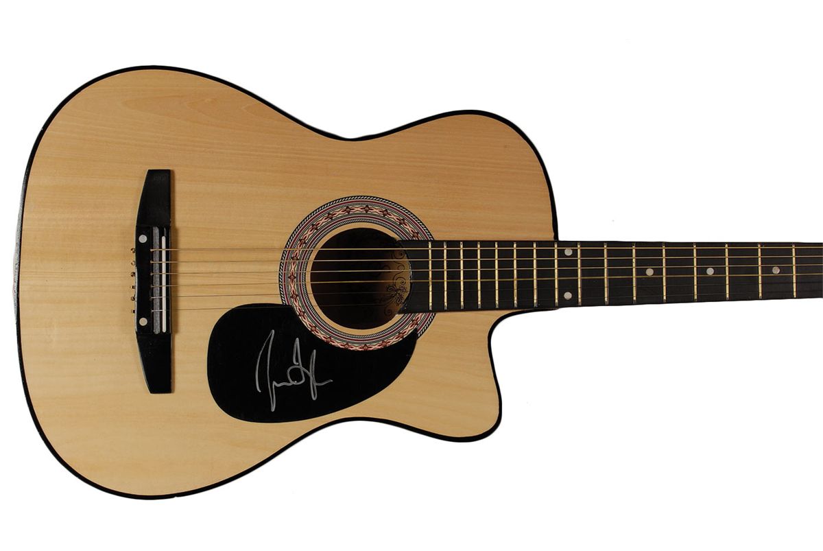 Natural wood-finish six-string acoustic guitar, signed on the black pickguard in silver ink. In fine condition. Accompanied by a photo taken at time of signing. Oversized.