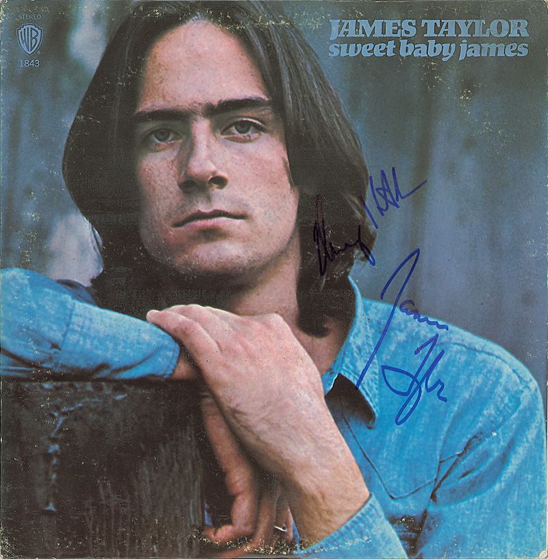 Two albums: Sweet Baby James, signed on the front cover in blue felt tip by Taylor and Danny Kortchmar; and Dad Loves His Work, also signed on the front cover in blue felt tip. In fine condition, with scattered wear to both covers. The records are included.