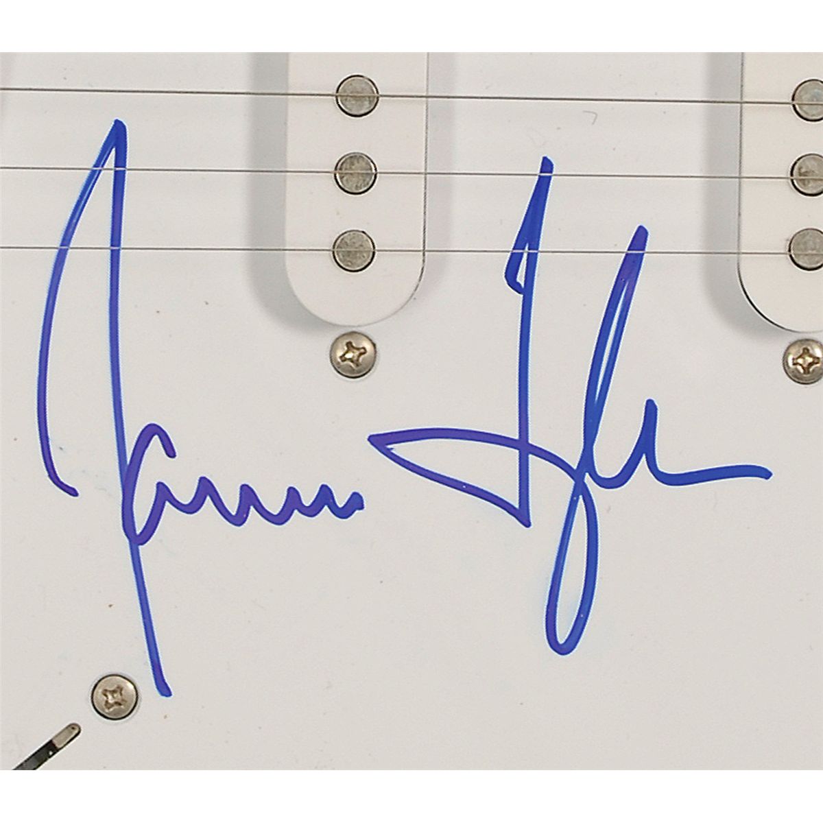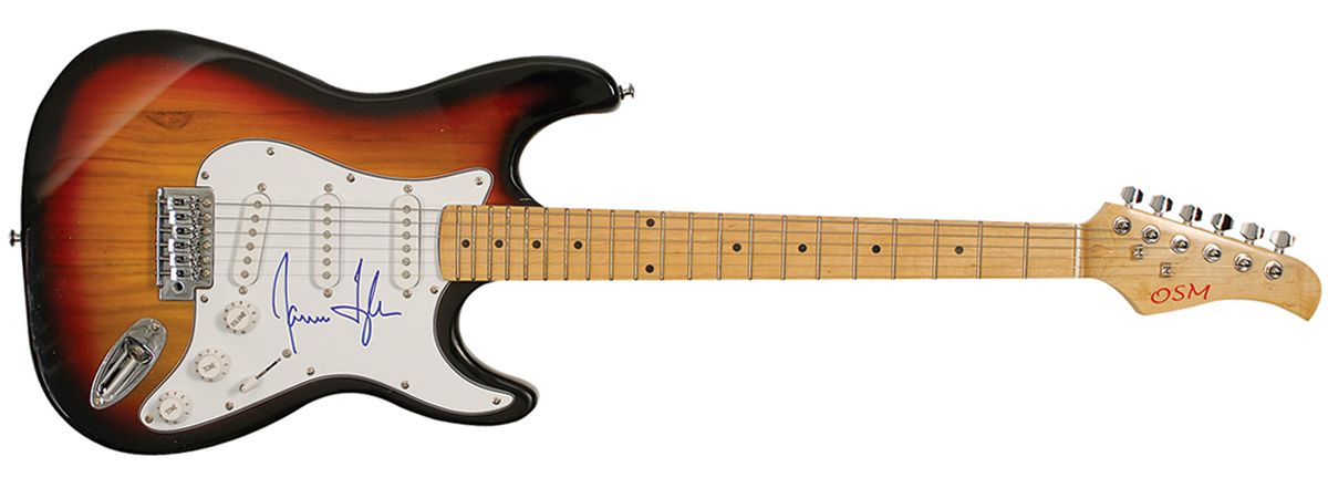 Sunburst-finish OSM ‘stratocaster-style’ electric guitar, signed on the white pickguard in blue felt tip by Taylor. In fine condition. Oversized.