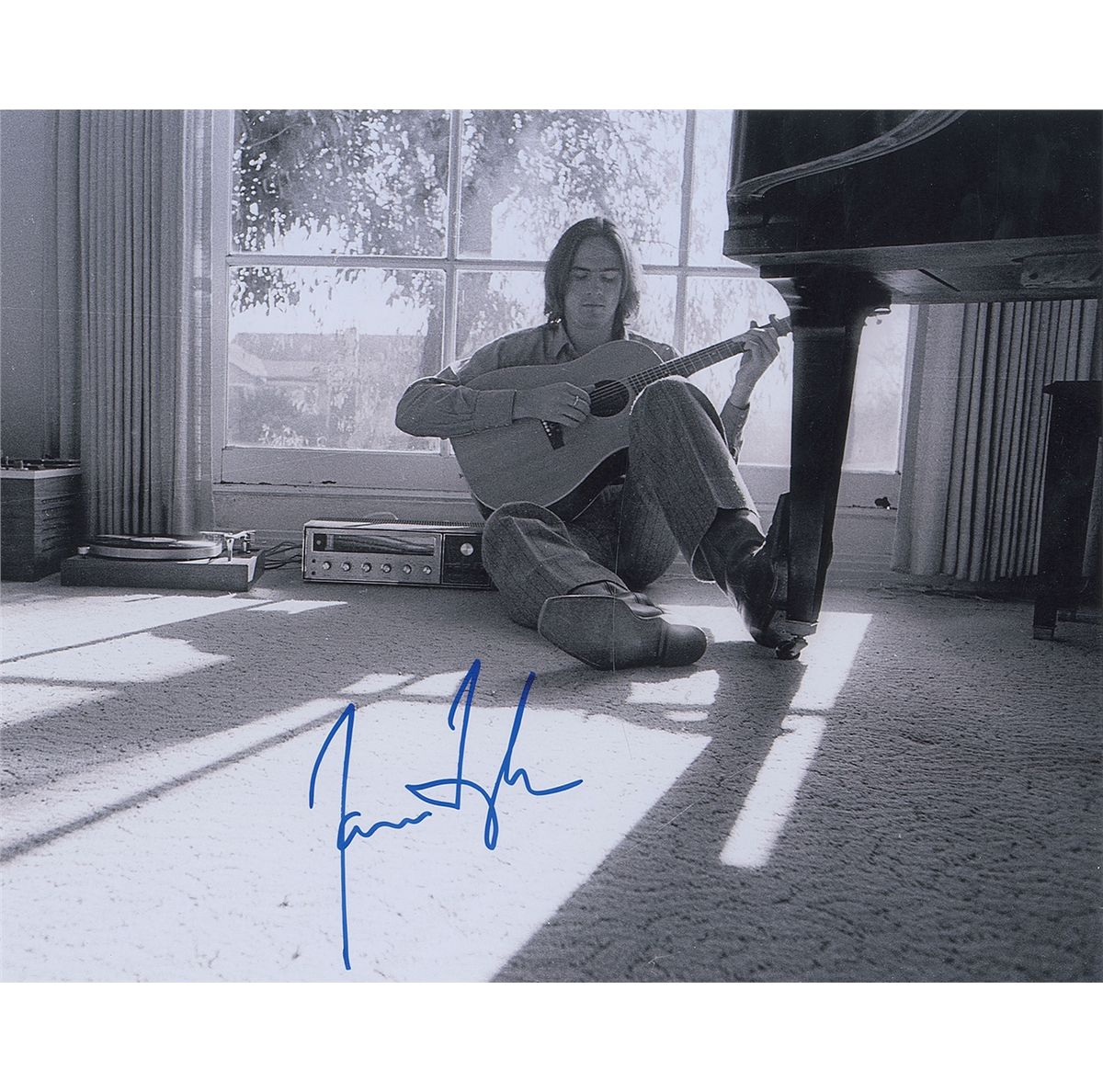 Satin-finish 14 x 11 photo of Taylor sitting on the floor picking at his guitar, signed in person in blue felt tip. In fine condition. Originally obtained by in-person specialist Mike Wehrmann.