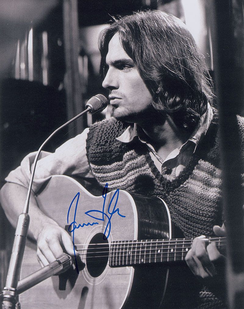 Satin-finish 11 x 14 photo of Taylor performing with his acoustic guitar, signed in person in blue felt tip. In very fine condition. Originally obtained by in-person specialist Mike Wehrmann.