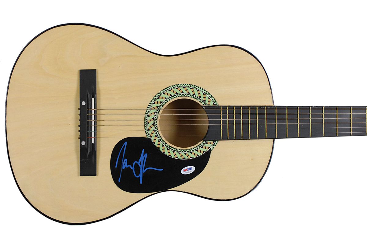 Natural wood-finish six-string acoustic guitar, signed on the pickguard in blue ink by Taylor. In fine condition, with a PSA/DNA authentication label affixed to pickguard. Accompanied by a certificate of authenticity from PSA/DNA. Oversized.