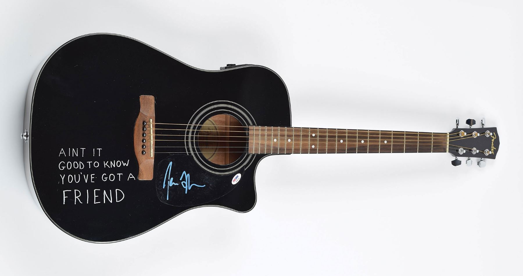 Black-bodied Fender CD-60CE acoustic-electric guitar, signed on the affixed pickguard in blue paint pen by Taylor. Another hand has added 'You've Got A Friend' song lyrics on the body in silver ink. Includes a Fender hardshell carrying case. In fine condition, with light scuffing to the pickguard and a PSA/DNA label affixed to pickguard. Accompanied by a photo taken at the time of signing and a certificate of authenticity from PSA/DNA.