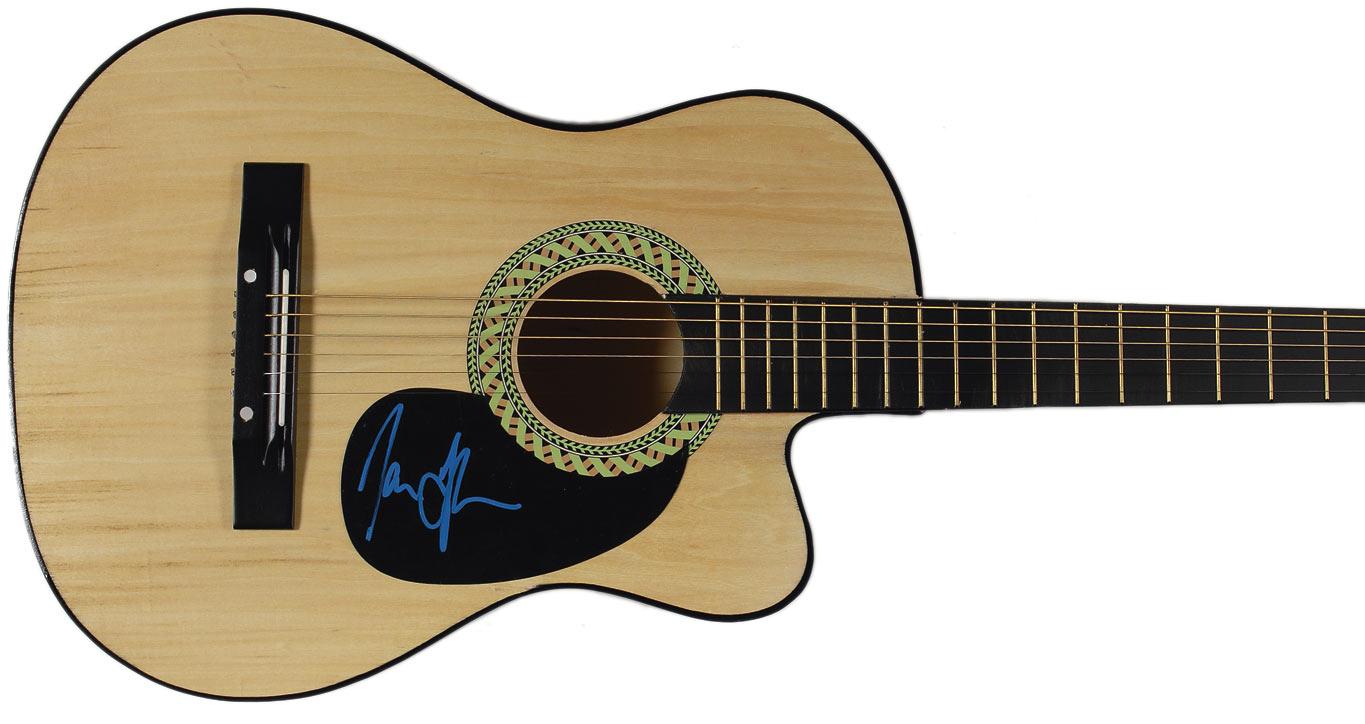 Natural wood-finish six-string acoustic guitar, signed on the black pickguard in blue ink. In fine condition. Oversized. RRAuction COA.