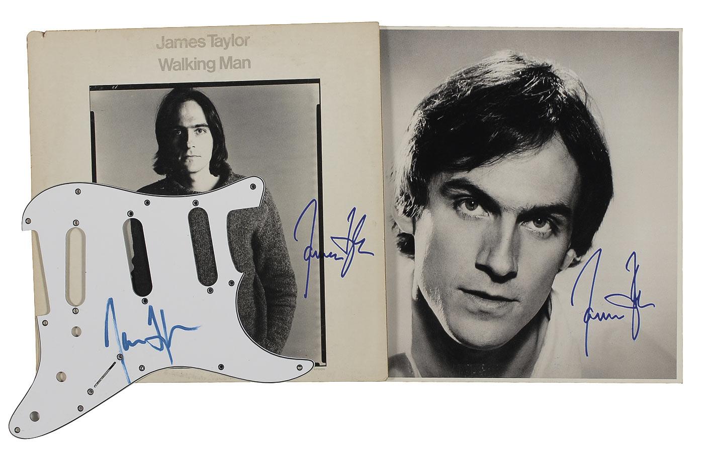 Three items: two signed albums, Walking Man and JT, each signed on the front cover in blue felt tip; and a white pickguard for a standard-size stratocaster, also signed in blue felt tip. In fine condition, with some scattered light wear to album covers. The records are not included. RRAuction COA.