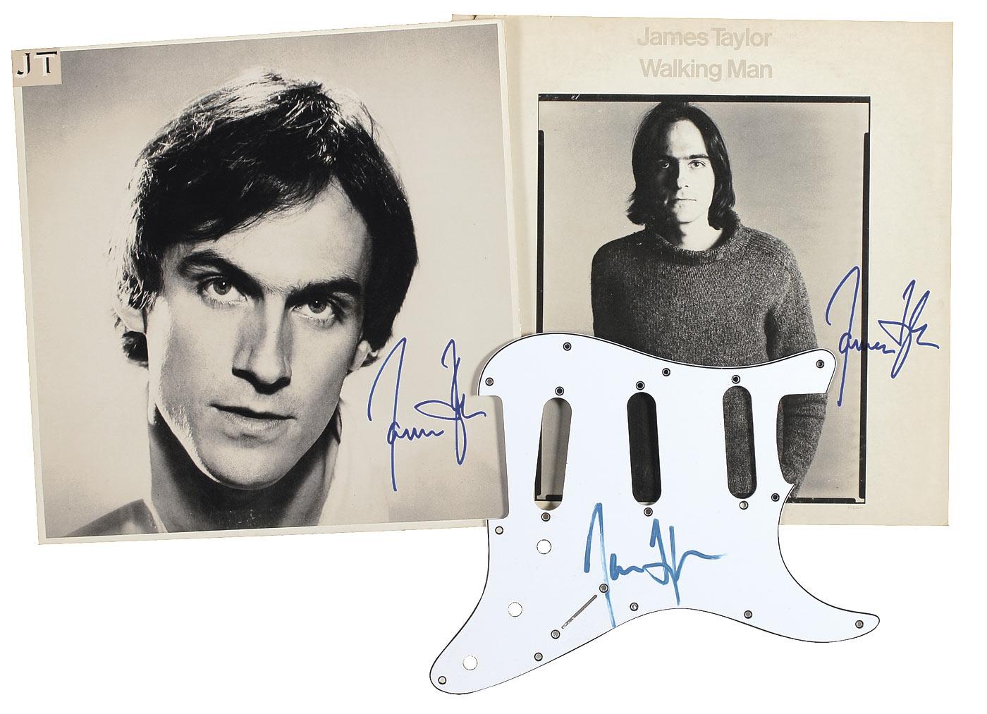Three items: two signed albums, Walking Man and JT, each signed on the front cover in blue felt tip; and a white pickguard for a standard-size stratocaster, also signed in blue felt tip. In fine condition, with some scattered light wear to album covers. The records are not included.