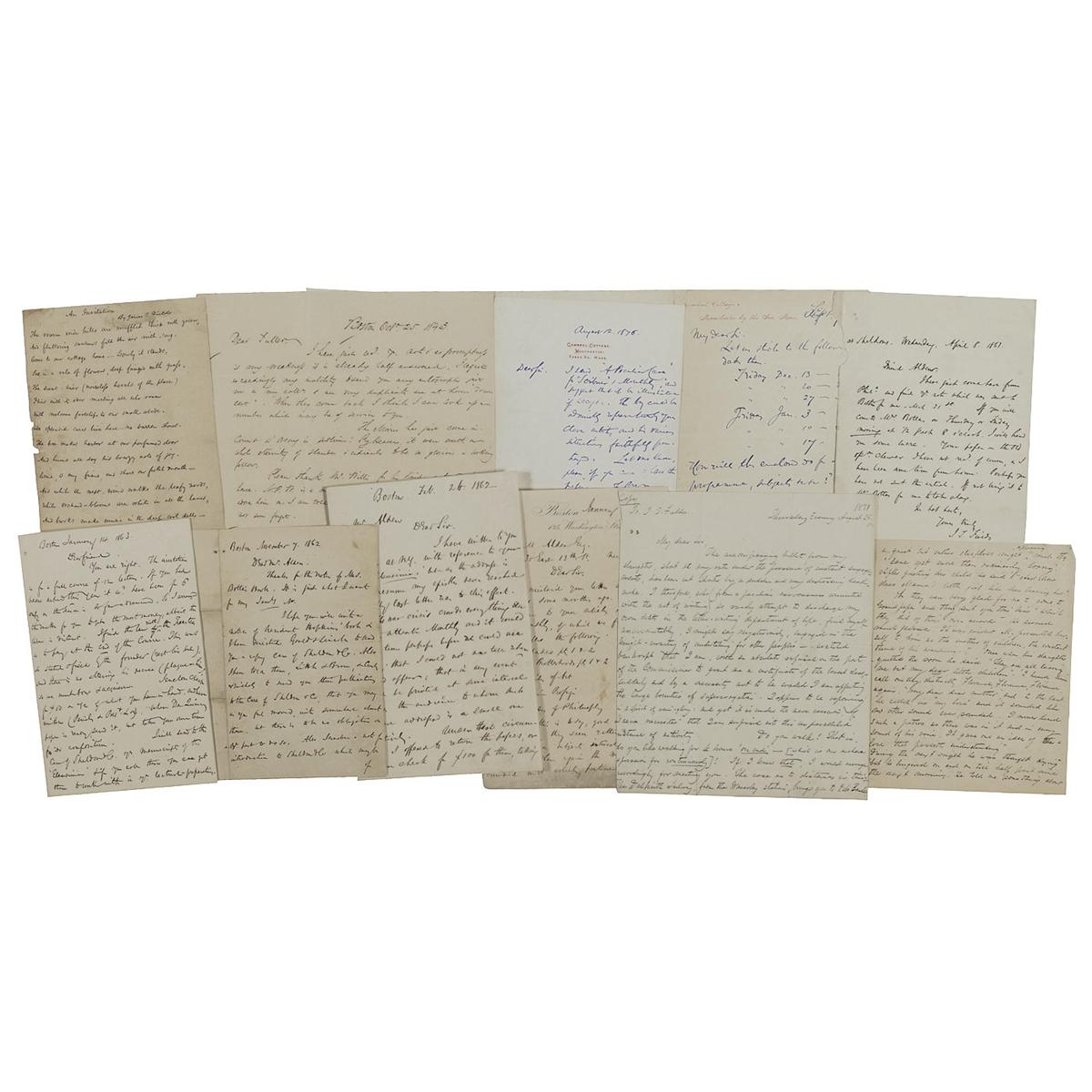 Publisher and author (1817–1881). Beginning in 1845 as Ticknor, Reed and Fields and later as just Ticknor and Fields, his firm published the original works of many of the prominent American authors and poets of the nineteenth century including: Emerson, Hawthorne, Holmes, Longfellow, Lowell, Stowe, Thoreau, and Whittier. Thirty items: Nine ALSs, dating from the 1840s to the 1870s, to various recipients, including a handwritten poem entitled ‘An Invitation’ and initialed “J.T.F.” at its conclusion. Accompanied by nineteen ALSs from his second wife, Annie Adams Fields, to a Mr. Alden, a transcription copy of a letter from English author Thomas de Quincey to Fields, and a written account of de Quincey’s last hours in an unknown hand. In overall very good condition, with expected handling wear, toning, and soiling.