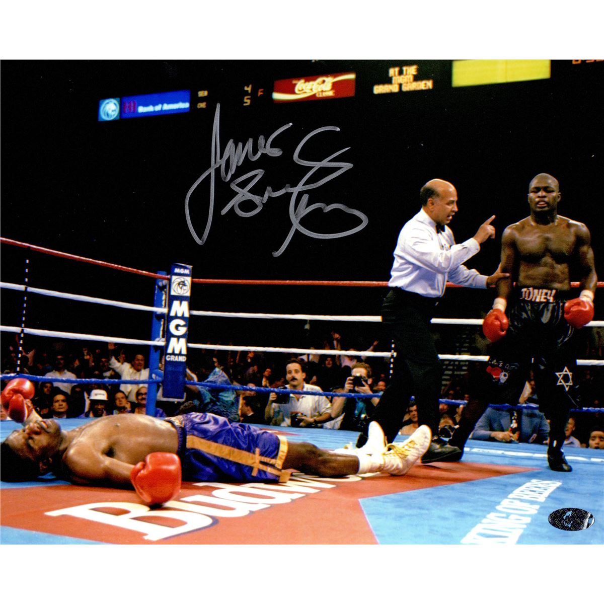 James Toney signed boxing action knockout 8x10 photo. Item comes with a Leaf Authentics tamper-proof numbered hologram and Certificate of Authenticity with matching number.