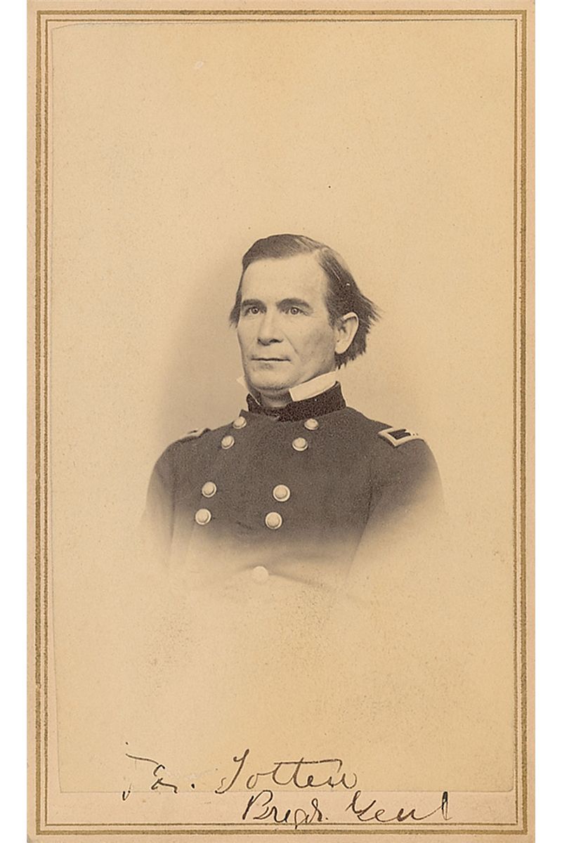 Union general (1818–1871) known for his ‘colorful’ way of issuing orders. Original 2.25 x 4 carte-de-visite photo by Troxell & Brother of St. Louis, signed in the lower border in black ink, “Jam. Totten, Brig. Genl.” In fine condition.