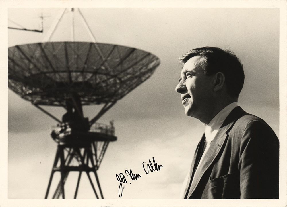 Vintage matte-finish 7 x 5 photo of James Van Allen, the award-winning space scientist, standing in front of a large satellite dish, signed in bold black ink, "J. A. Van Allen." In very fine condition.
