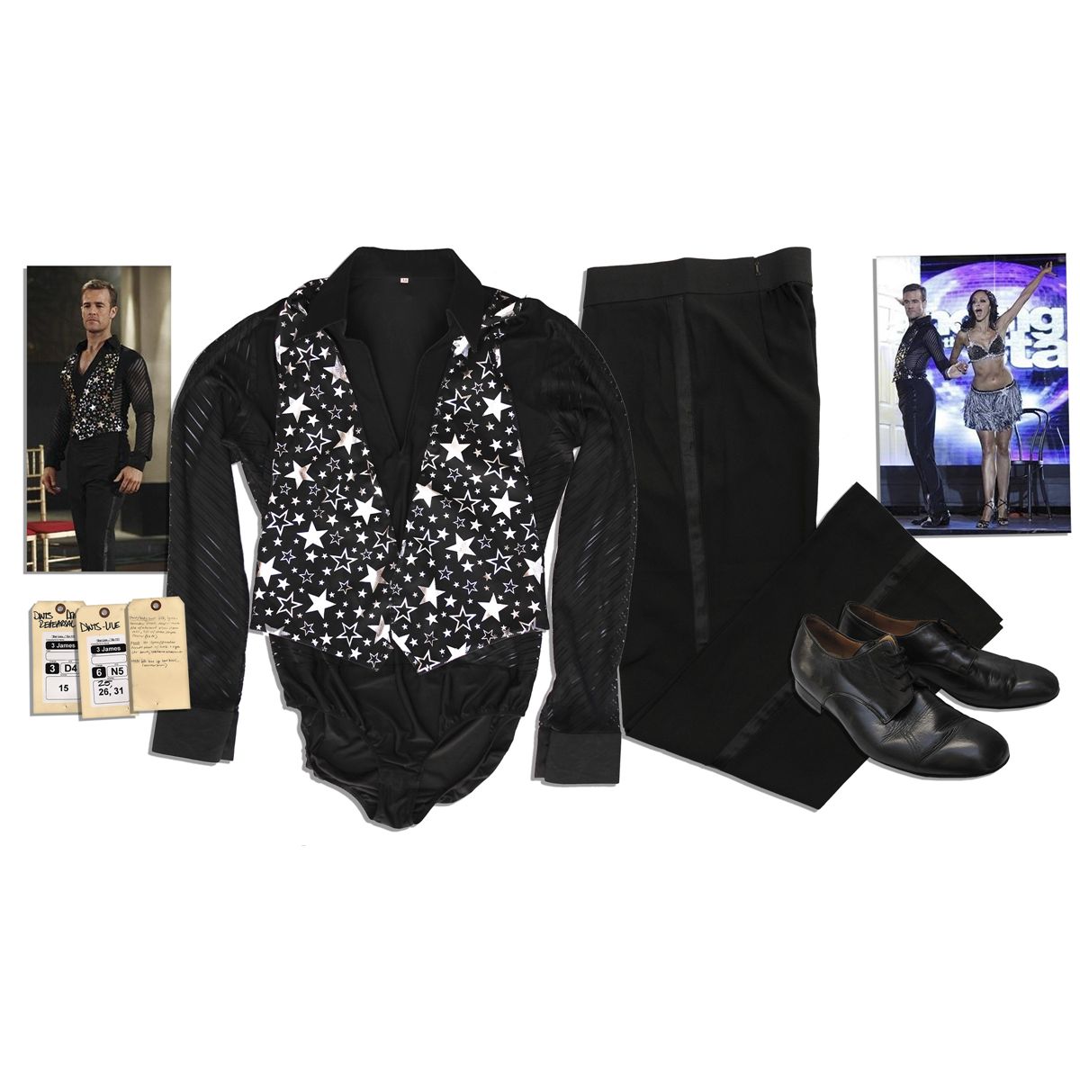 James Van Der Beek costume from ''Don't Trust The B---- in Apartment 23''. Flamboyant dance costume is from Van Der Beek's parody of ''Dancing With The Stars'' on the sitcom. Four-piece ensemble comprises (1) a black long-sleeved leotard with sheer sleeves, featuring sewn-on vest front with allover pattern of shiny silver stars in size M. (2) black trousers with black stripe down the sides, featuring elasticized waistband and velcro closure in approximate size 34 x 30. (3) pair of black leather men's ballroom dance shoes in size 10 by Werner Kerr, featuring suede soles and non-tying laces. Costume is near fine. With wardrobe department's official tag.