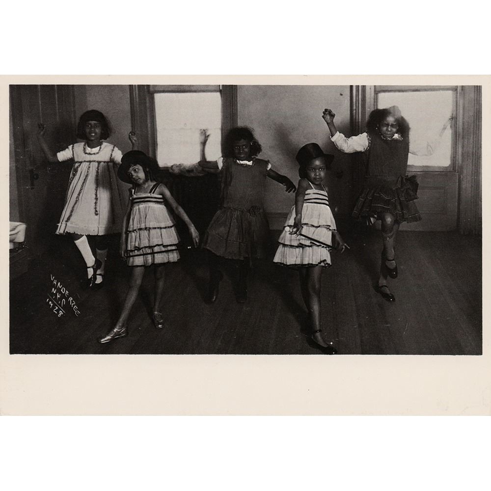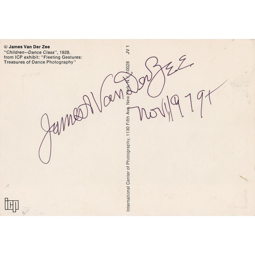 Influential African-American photographer (1886-1983) who was a leading figure in the Harlem Renaissance. Desirable 5.75 x 4 postcard of his photograph 'Children—Dance Class (1928),' signed on the reverse in thin black felt tip, "James A. Van Der Zee, Nov. 1979." In fine condition.