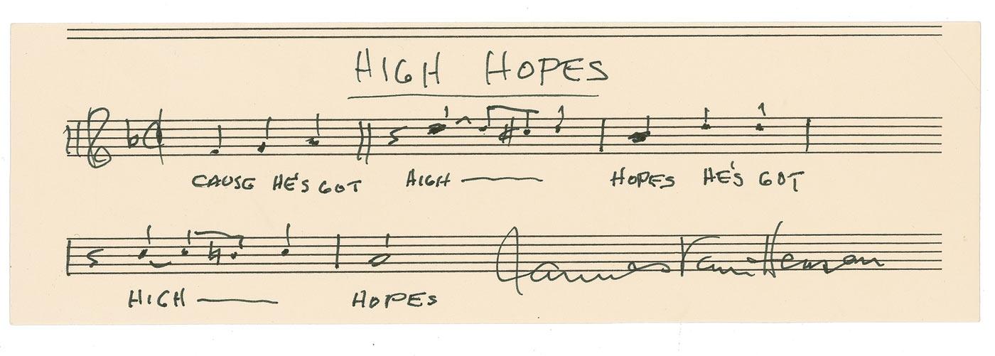 AMQS, signed “James Van Heusen,” on an off-white 9.5 x 3 musically-lined sheet. Van Heusen writes out five bars of music and lyrics to ‘High Hopes.” In very fine condition.